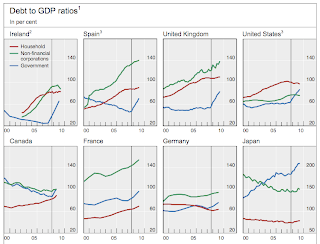 Here's what I'd note: that for countries like the US, Ireland, and Japan, government debt begins to substitute for private sector and household debt. Deleveraging is beginning to take hold, in other words, as one kind of debt substitutes for another. The blue line spikes, but the red and green lines decline or flatline. Here, debt has hit a limit, reflecting either stagnation (the US), penury (Ireland), or deflation (Japan).